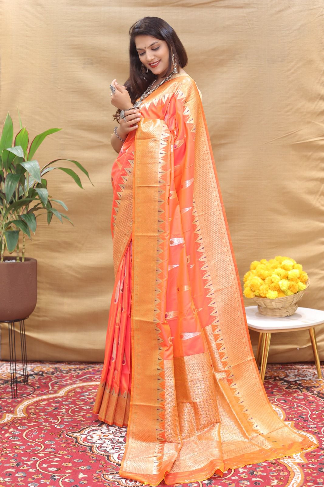 Intricate Peach Soft Banarasi Silk Saree With Capricious Blouse Piece