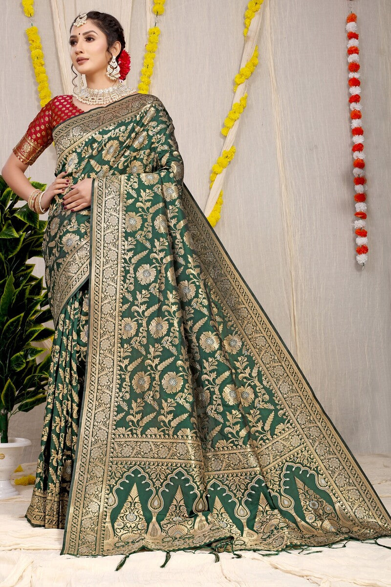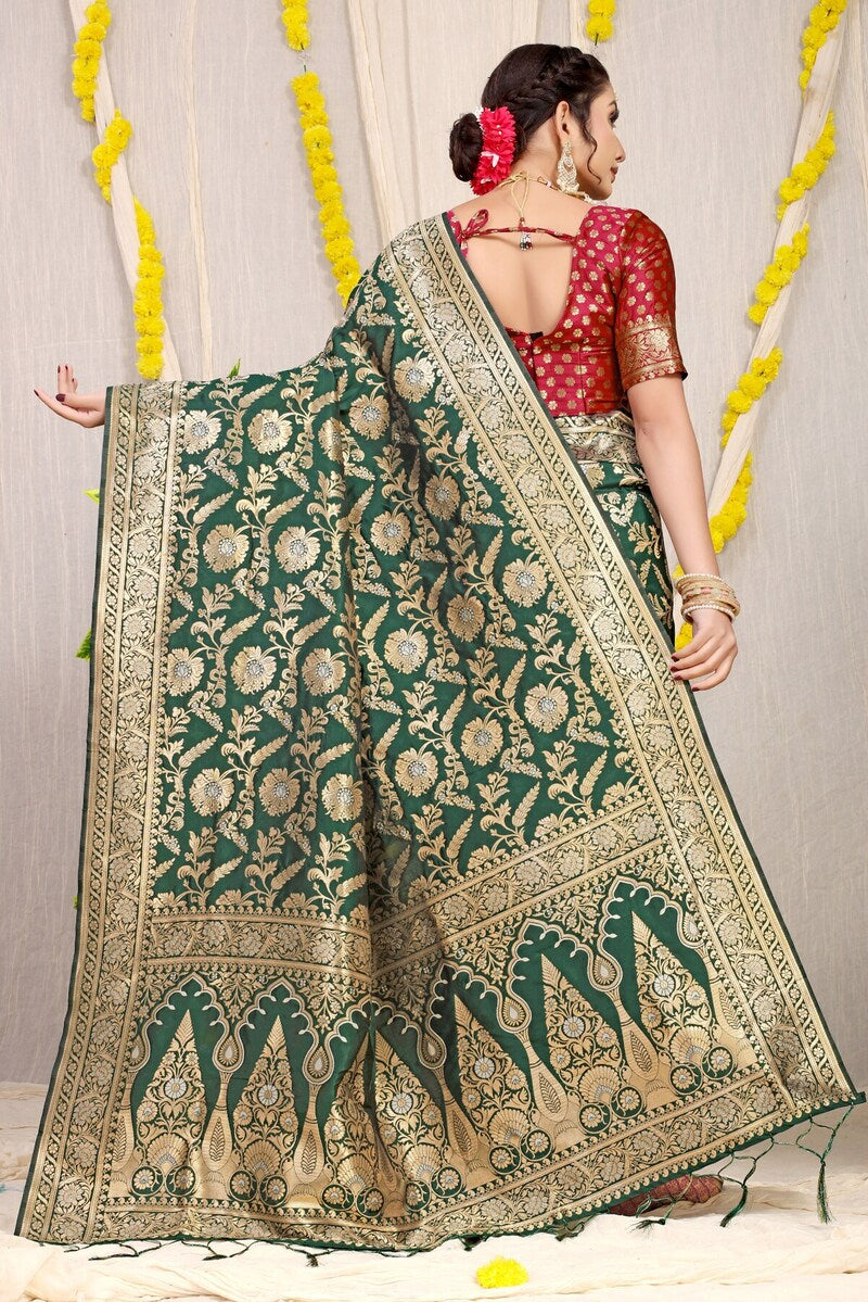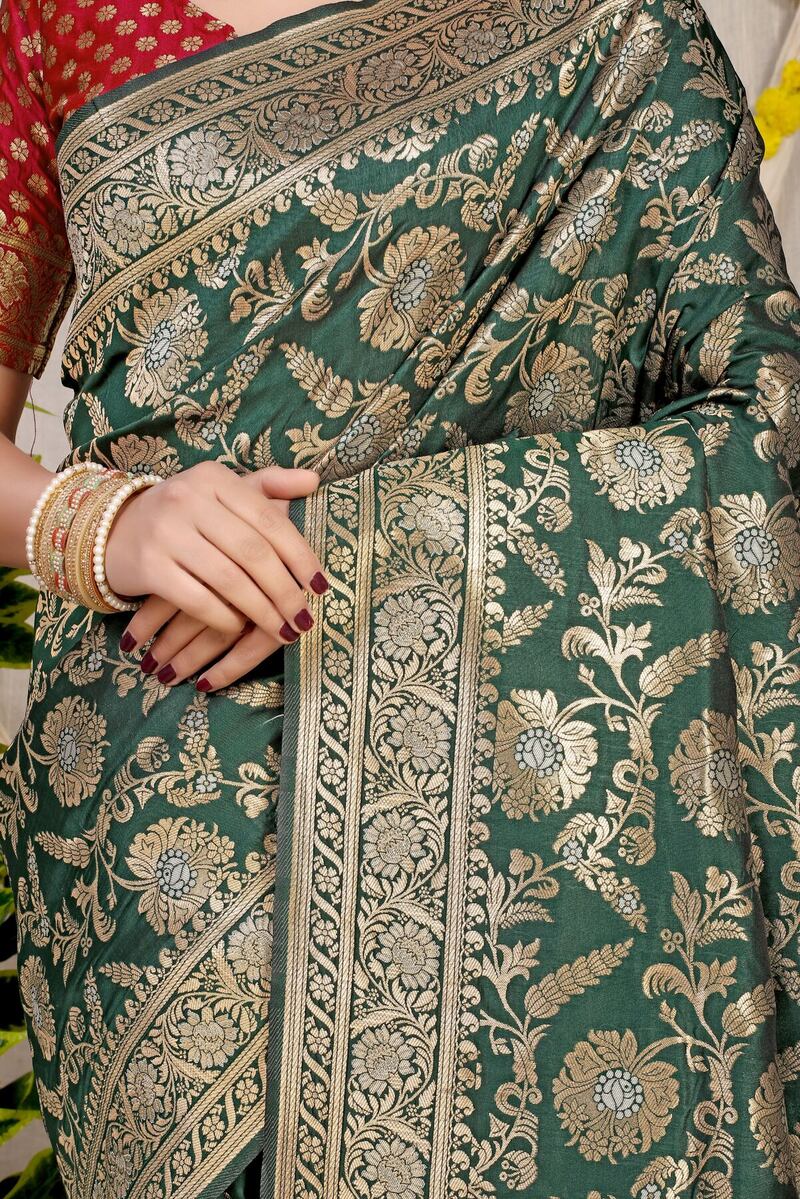 Lovely Dark Green Soft Banarasi Silk Saree With Nemesis Blouse Piece