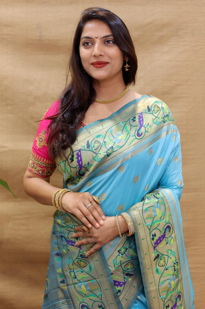 Magnetic Sky Paithani Silk Saree With Fantabulous Blouse Piece