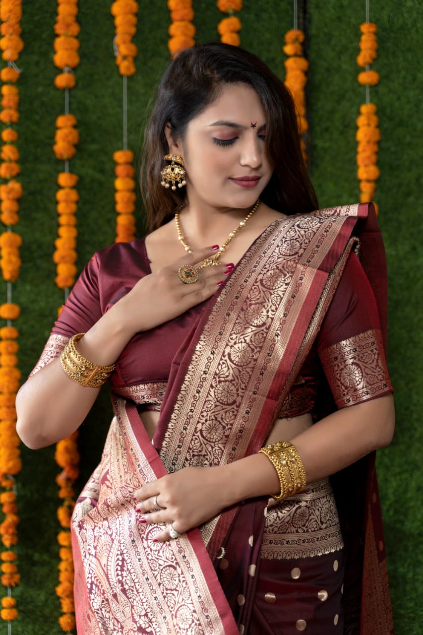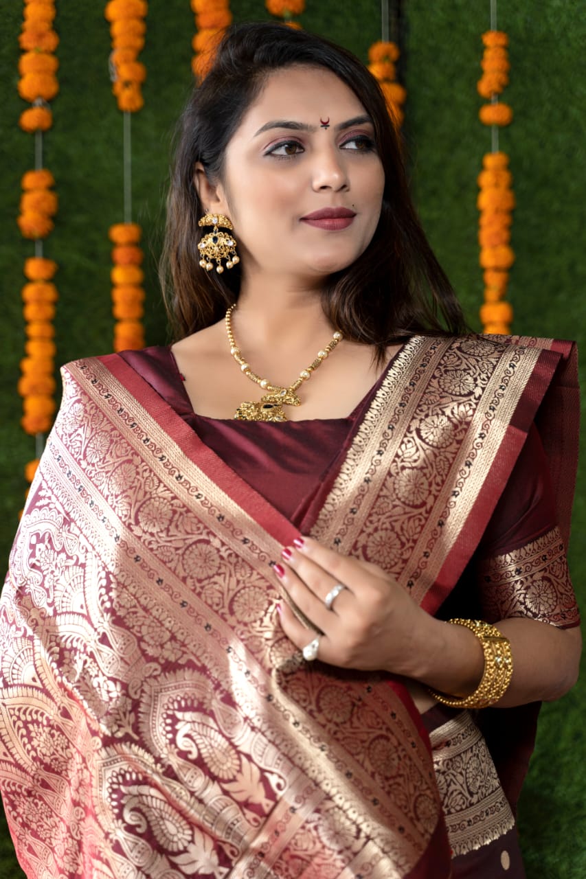 Marvellous Wine Banarasi Silk Saree With Most Traditional Blouse Piece