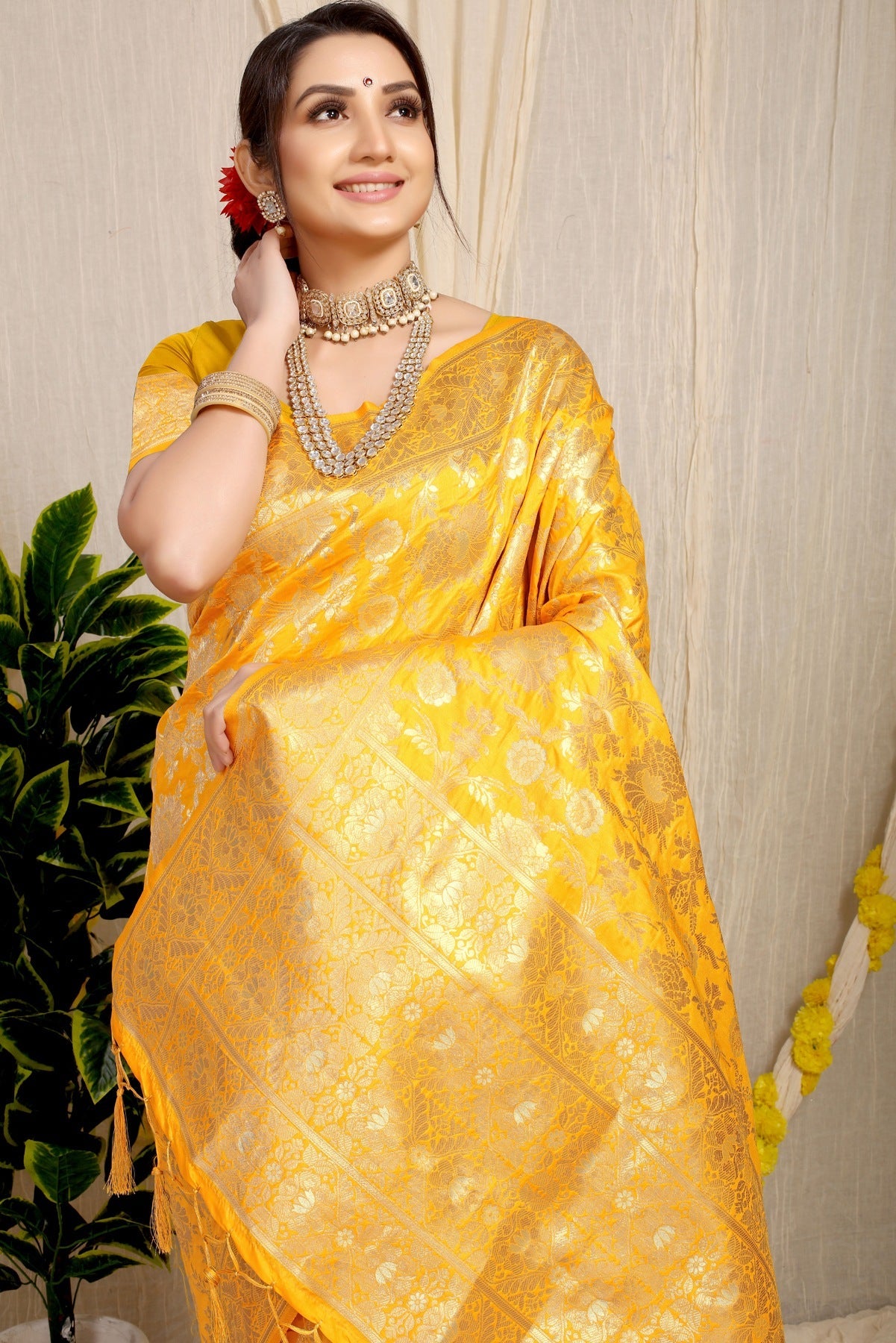 Prominent Yellow Banarasi Silk Saree With Fairytale Blouse Piece