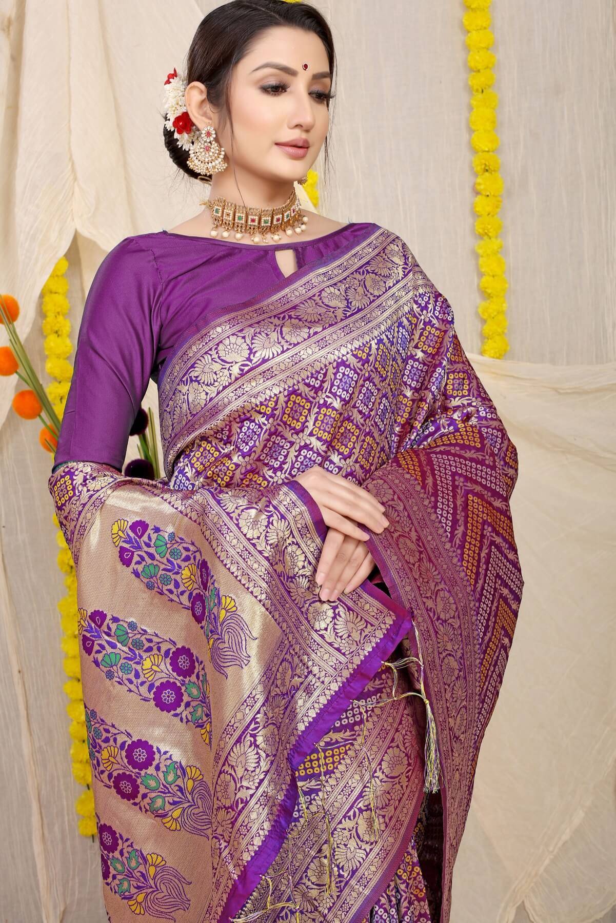 Choose this intriguing Daisy Purple Woven Soft Banarasi Silk Saree and strike the perfect note of sartorial symphony. these sarees are soaked in the charm of resplendent colors and fine silk fabric. A complimenting border and motif design make this saree a fascinating piece of art.
