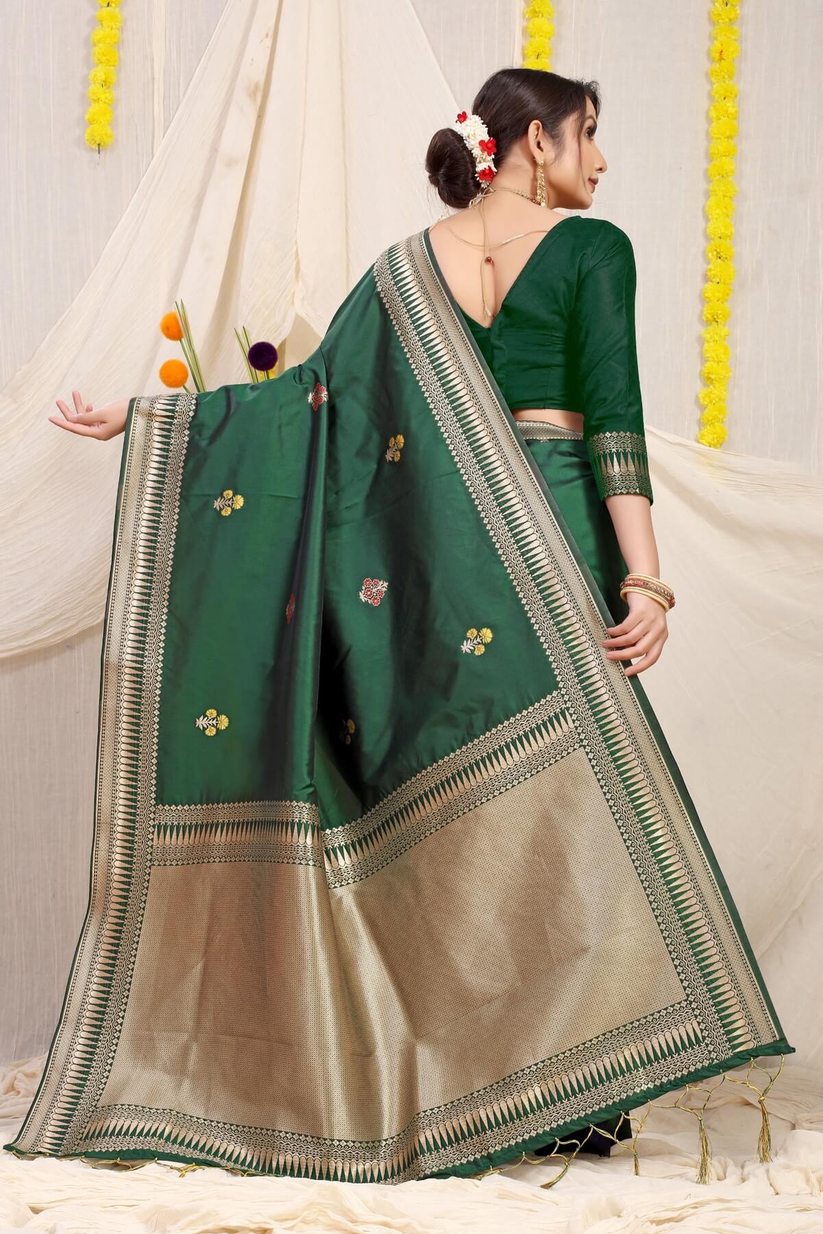 Sensational Dark Green Banarasi Silk Saree With Magnetic Blouse Piece