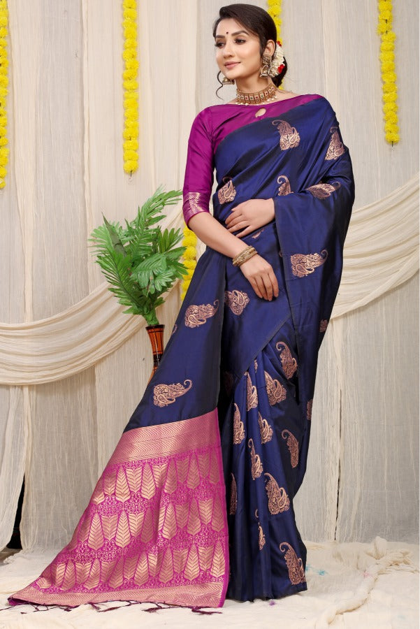 Sensational Navy Blue Banarasi Silk With Sizzling Blouse Piece