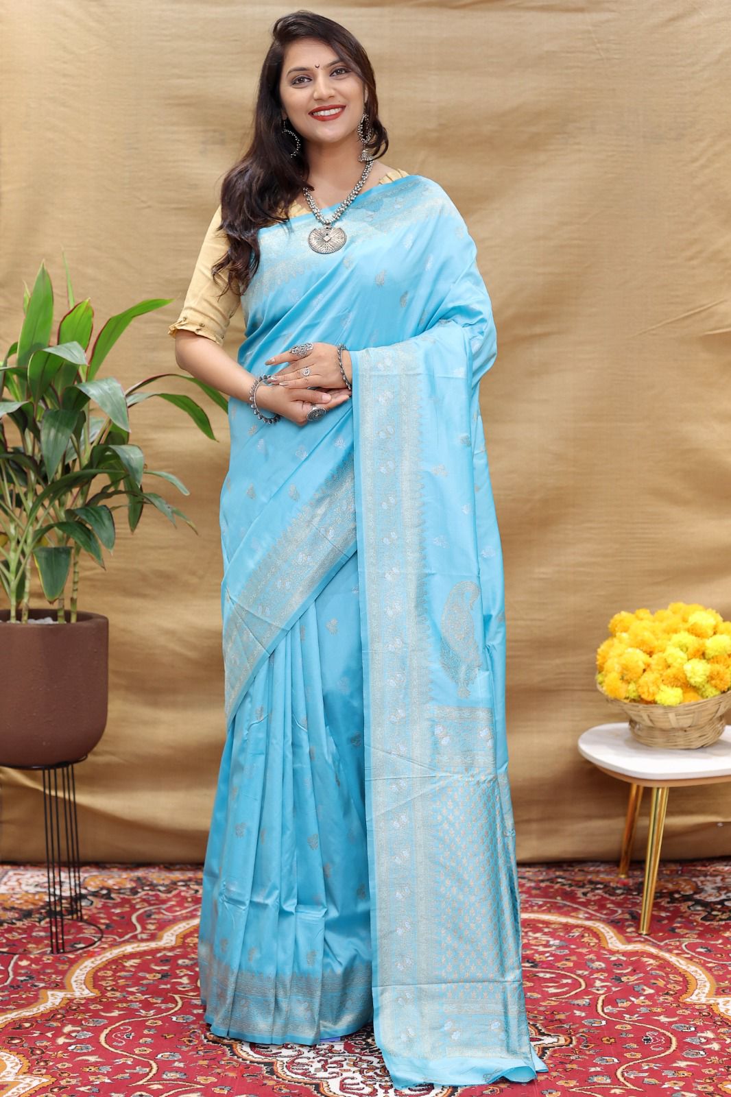 Smashing Sky Soft Banarasi Silk Saree With Tempting Blouse Piece