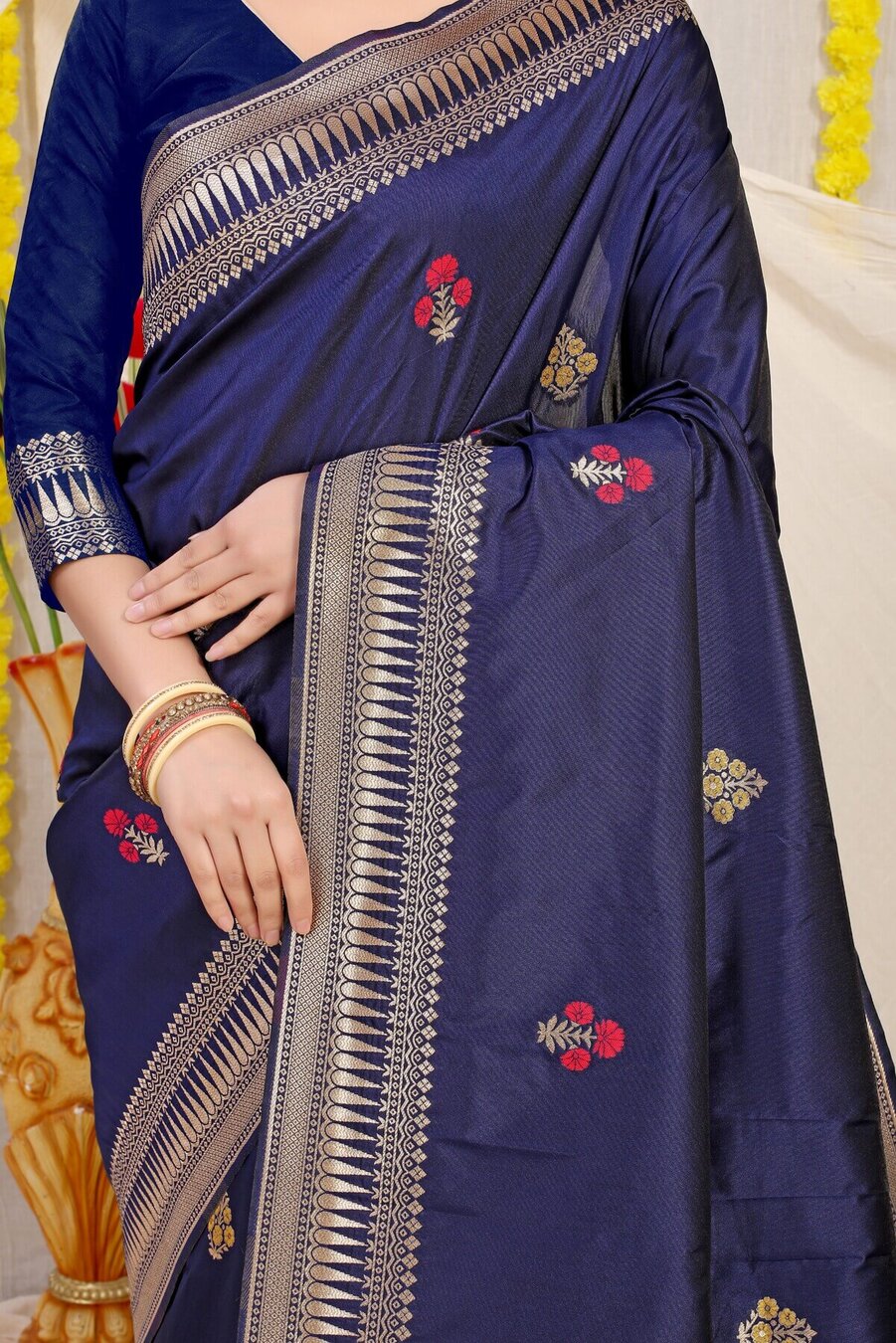 Stylish Navy Blue Banarasi Silk Saree With Magnetic Blouse Piece