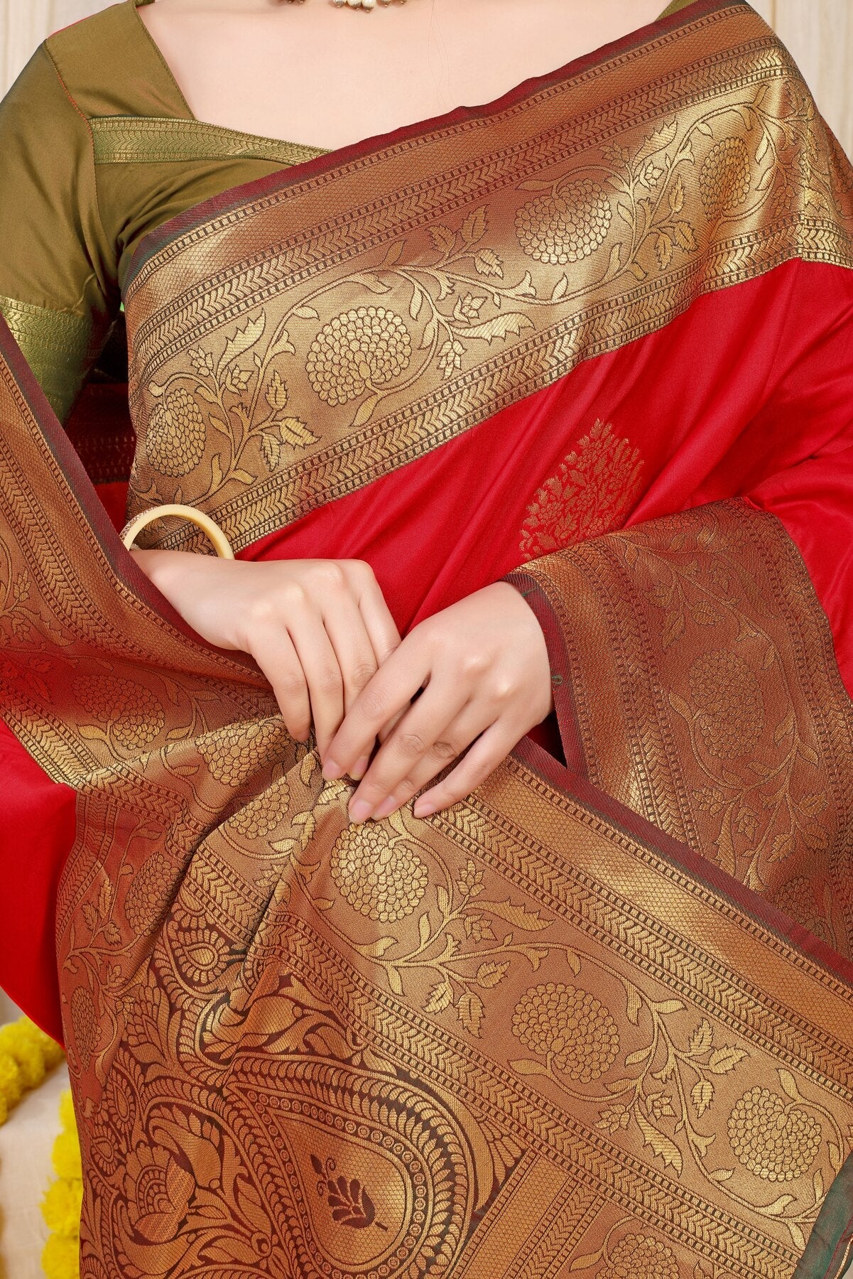 Stylish Red Banarasi Silk Saree With Forbearance Blouse Piece