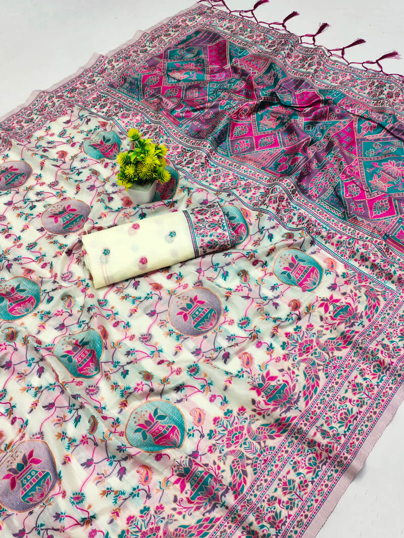 Susurrous Beige Pashmina Saree With Phenomenal Blouse Piece
