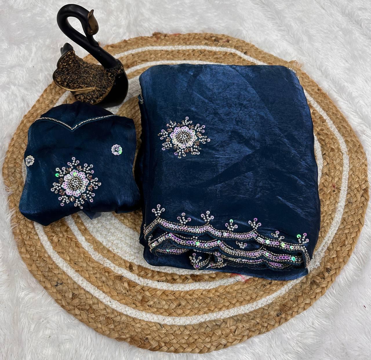 Traditional Blue Sequence Work Fandy Silk Saree With Demure Blouse Piece