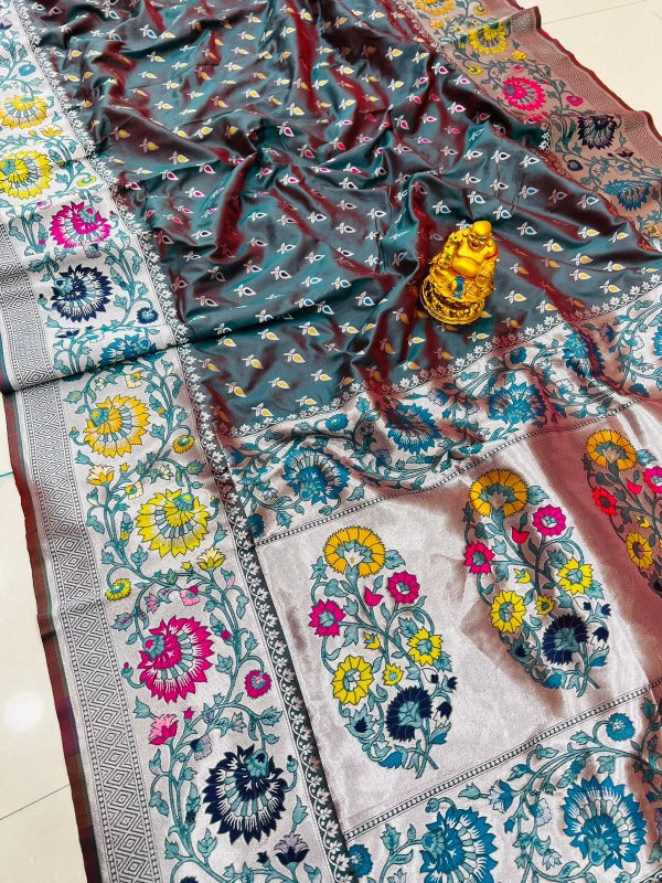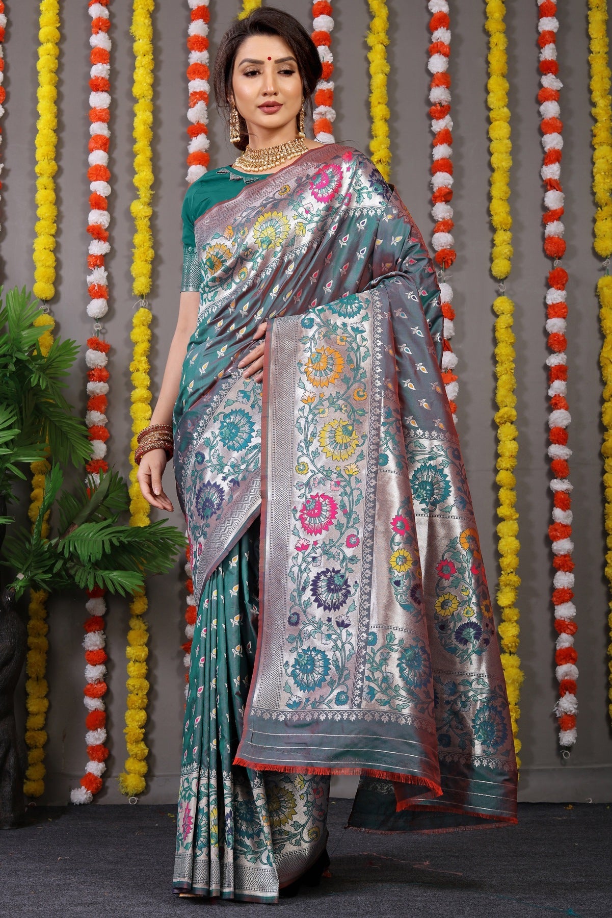 Unique Rama Banarasi Silk Saree With Scintilla Blouse Piece