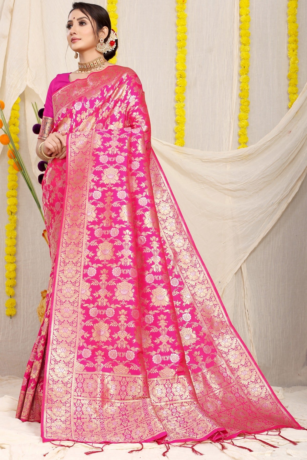 Wonderful Dark Pink Banarasi Silk Saree With Fairytale Blouse Piece