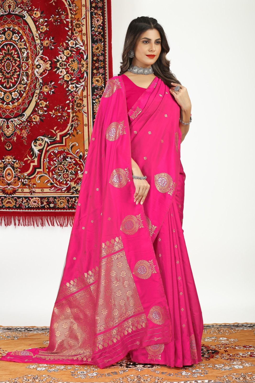 Indulge in the timeless opulence of traditional Banarasi silk with our premium range of sarees. With a regal touch and exquisite craftsmanship, these sarees are the epitome of luxury fashion. Each weave boasts intricate designs and rich textures that are sure to make heads turn. Experience the unparalleled beauty and elegance of Banarasi silk, brought to you with utmost finesse and precision.