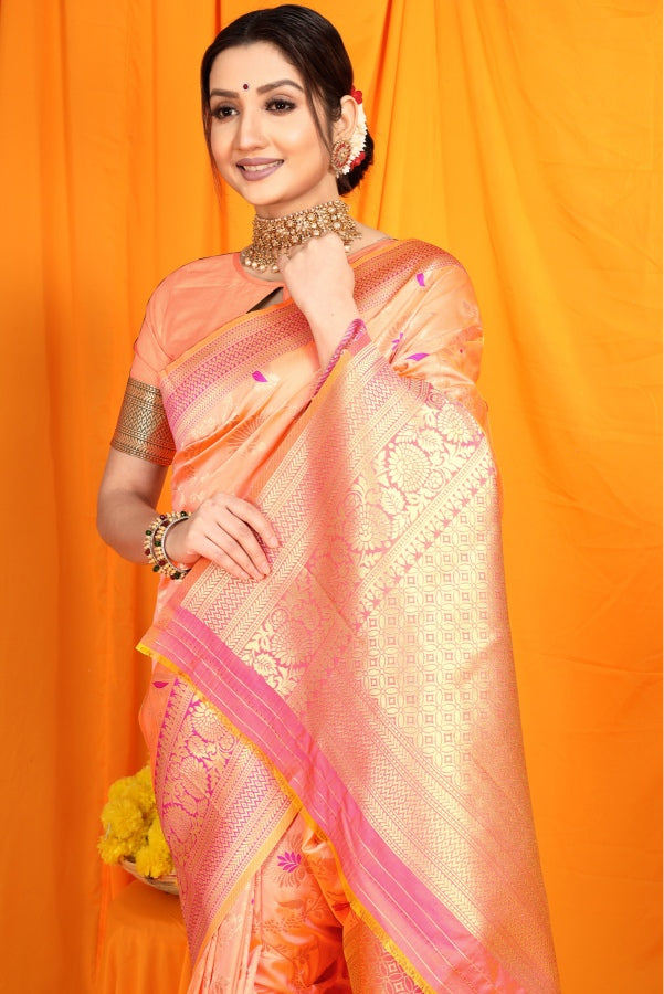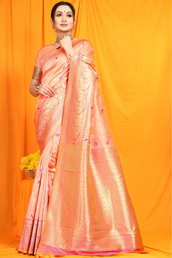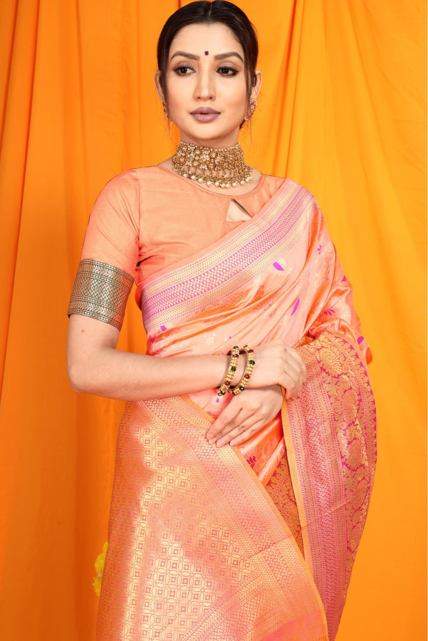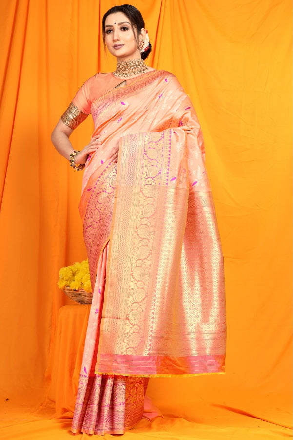 Wonderful Peach Kanjivaram Silk With Tremendous Blouse Piece